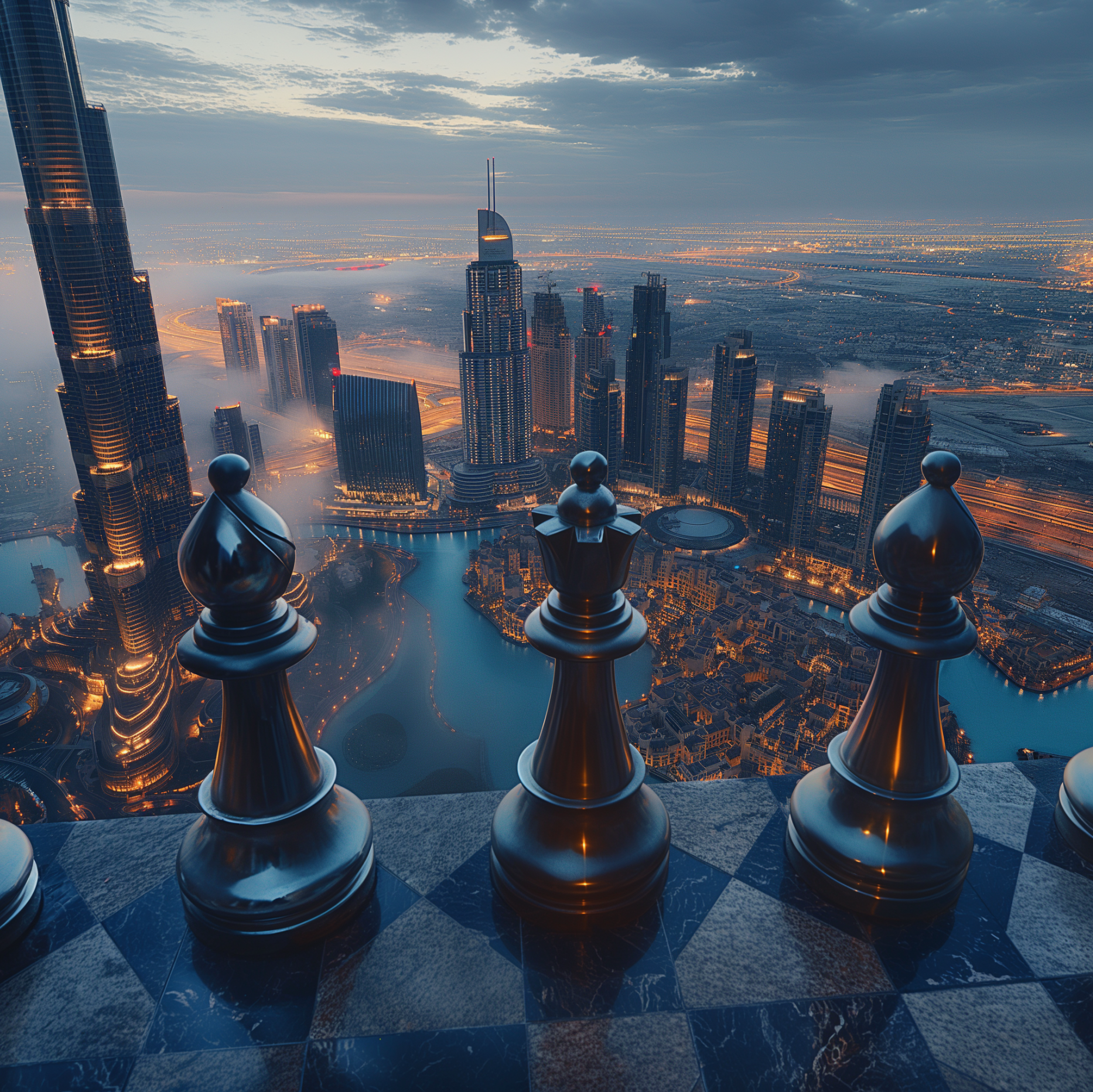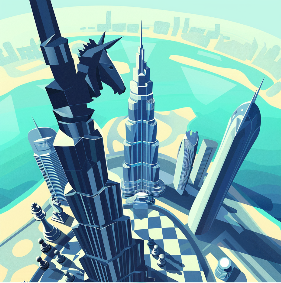 Aerial shot with dubai sky city, shape of a Horse chess piece and soldier chess pieces, in an exciting scene, flat illustration style .