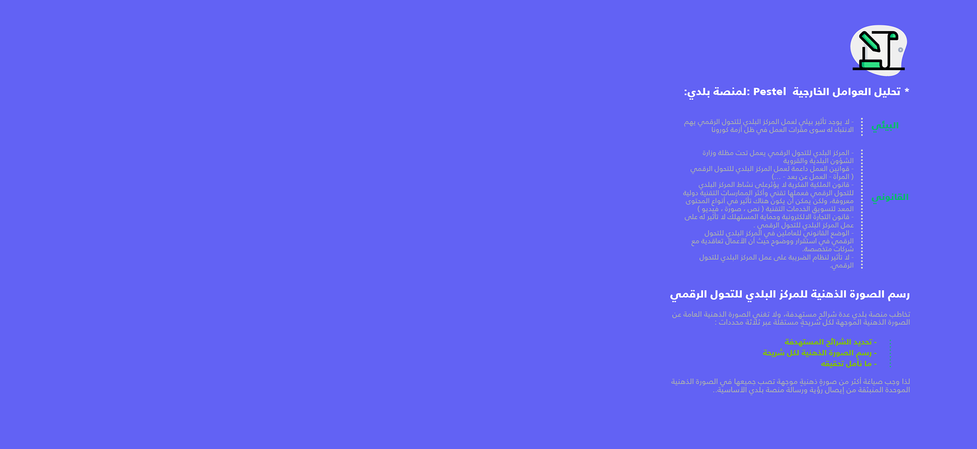 "Building on the diligent work carried out by the Municipal Digital Transformation Center management, through its specialized team, to establish a unique technical model by harnessing all capabilities and competencies, integrating administrative thinking with technical expertise in business management, creating a distinctive model for modern municipal digital services. Amidst all efforts to enhance operations stands the public platform strategy, serving as a roadmap to guide all departments in the Municipal Digital Transformation Center towards a common goal, emphasizing the importance of working as one team, with one spirit and a shared objective. From this perspective, professional communication efforts within this system are essential to the success of the team and the goals of the Municipal Digital Transformation Center, including adhering to the center's general digital transformation policy, working within its vision and mission, achieving the overall objectives of the center's digital transformation strategy, and studying external factors from an organizational communication perspective."